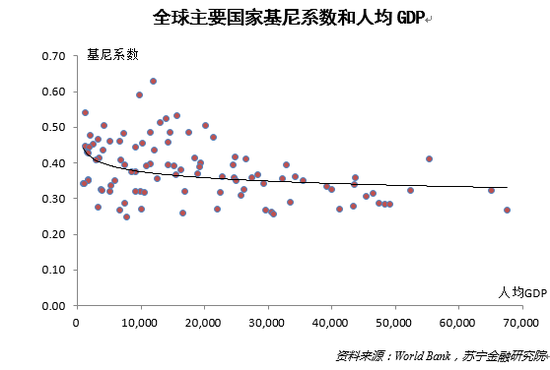 其次,从国别的横向比较来看,收入水平更高的国家,其收入不均衡的程度可能是更低的。下图中,基尼系数(反映收入不均衡的程度,0代表绝对均衡,1代表绝对不均衡)与一国人均GDP之间的关系呈现了不太明显的负向关系。这背后的原因是,收入水平更高的国家,就有了更多的资源用于支付福利,用于缩小各类人群之间的收入差距。而以新兴经济体为代表的中低收入国家,其主要的精力投入在经济增长和效率提高上。