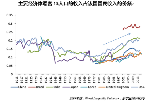 经过进一步的数据观察,我们发现,一百年以来,全球主要经济体的财富分配趋势不容乐观。美国和英国等发达国家、日韩等东亚国家、巴西等拉美国家、中国和印度等各类发展类型和阶段的国家,几乎都在20世纪70年代以后开始出现了财富分配的持续分化,这些国家最富的1%人口所拥有的财富占全国总财富的比重持续上升。