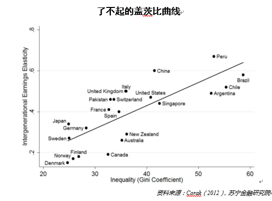 上图中,横轴为基尼系数(收入不均衡程度),纵轴为“代际收入弹性”,用以衡量父代的收入影响下一代收入的程度。从图中可以看出,父代的影响与收入不平等高度相关,形成了一条向右上方倾斜的曲线。这条曲线被广泛地用来讨论“美国梦”是否已经幻灭,这与那部著名小说《了不起的盖茨比》的主旨非常吻合,因此将其命名为“了不起的盖茨比曲线”。