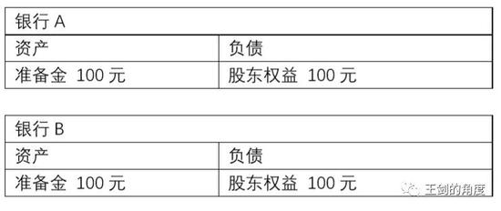 我们假设有银行A和B。各自持有存款准备金100元,且都来自股东权益。