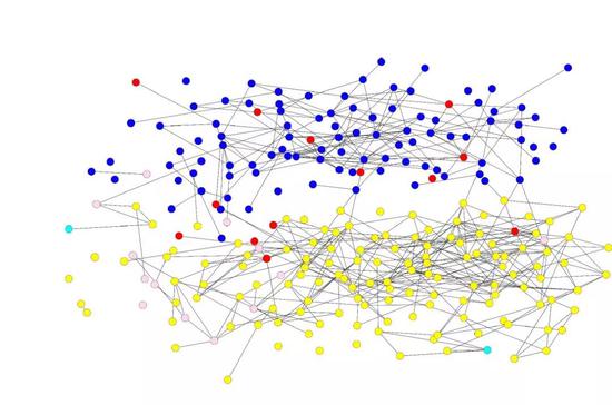 还是刚才那个学校的例子。通过种族把这个节点用不同颜色标注出来,黄色代表白人,蓝色是黑色种族,红色是西班牙裔的,可以发现,尽管在同一个学校、很多课是一起上的,友谊模式也是分裂开来的,不同的群体当中他们的联系、连接比较少,背后的原因很重要的一点是,它会导致很多不同行为或者模式。这种现象在美国高中非常普遍。