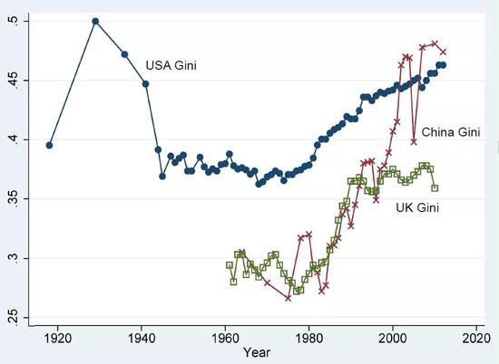 在社会当中,不同群体当中会产生什么样的影响?上图反应的是各国的基尼系数(考察社会的不平等状况),可以看到,在一个不平等度很高的国家社会,代际收入流动性会非常差,美国的基尼系数在三四十年代降低,然后又在升高。中国的系数在60年代比较低,80年代以后开始上扬。美、中、英分别是北美、欧洲、亚洲的典型代表国家。