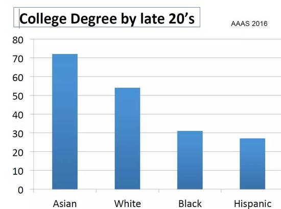 如果大家看一下教育水平的差距就能够理解,为什么说代际收入的流动性不一样。在美国,有大学学位的人在不同的人种或者人群之间有不同的比例分布,白人大概50%的25-30岁的年轻人有大学学位,黑人只有30%,西班牙裔、美国人获得大学学位的人相对低,亚洲裔获得比较高,意味着不同的人群有不同的工作机会,在不同的群体之间有这样的差别。