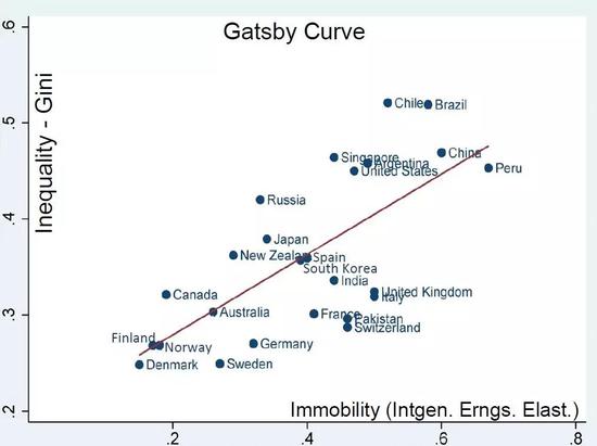 盖茨比曲线是加拿大教授迈尔斯·克拉克发明的,体现的是社会不平等程度。在不平等程度高的社会里,父母收入和子女收入正相关,代际收入流动性非常差,也就是说你父母穷很可能你也会很穷,你父母很富你就会很富。