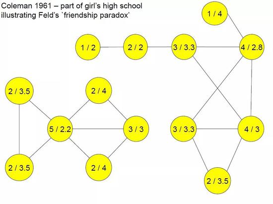 “友谊悖论”是1991年社会科学家Feld提出的,是指人们总觉得我们的朋友人缘比我们更好,联系网更大,更受欢迎。Coleman在1961年做过一个关于一所女子学校学生友谊连接的研究。图中每个节点里的数字,第一个数字表示一个人有多少个朋友,第二个数字表示他的朋友平均有多少个朋友。平均来说,大多数人都会觉得自己的朋友比自己的人缘更好。