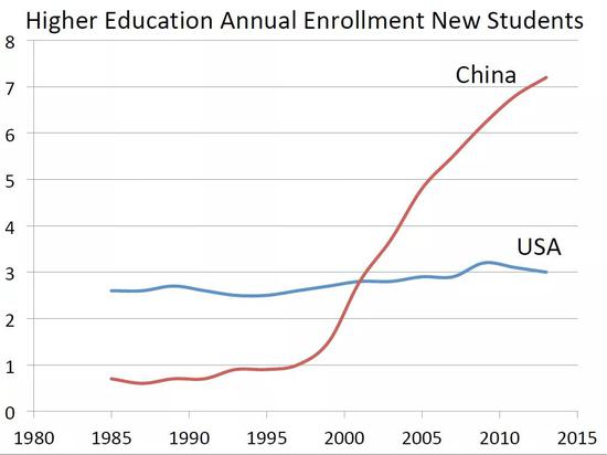 还有一点非常有意思:廉价可获得的教育机会非常重要。这个图是中国和美国大学录取新生的情况,美国的曲线相对平缓,中国的曲线相对比较陡峭。从90年代末期起,尤其是从1997年或者1998年以后曲线开始上扬,中国大学开始扩招,更多的人可以进入大学学习。