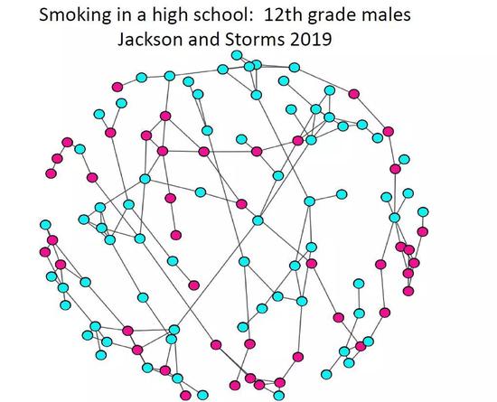 这是我们在斯坦福大学做的一个关于高中生吸烟情况的研究。图中红色是表示吸烟的同学,蓝色的是不吸烟的同学。可以看到,如果说你的朋友是抽烟的,你会看到更多的人开始抽烟,确实验证了这样的情况,他们受到朋友习惯影响的程度是40%。在这样的学校,如果说想降低抽烟率,应该让学生更多的了解这样的模式。