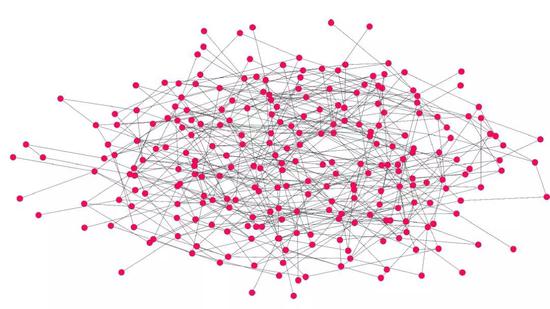 一个高中有205名学生,他们之间的友谊关系,基于“每个人之间都有友谊的连接”这一假设,电脑随机生成了第一张图——205个学生,有205个节点,他们就像面条一样连接在一起。