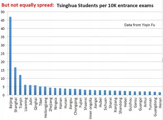 教育高速发展是好的一面,同时另一方面,是否实现机会均等化或者说教育更加公平?拿清华为例,上图表示的是每1万个考生有多少人考入清华,可见不同城市分布并不均匀。