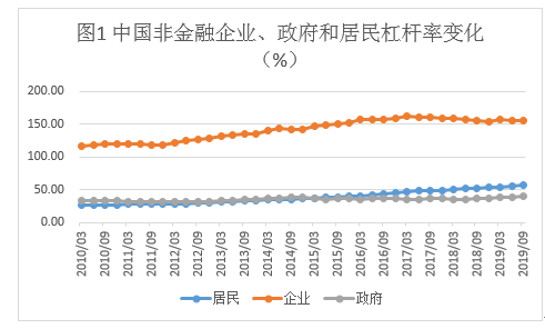 从中国实体经济部门间的杠杆率比较看,中国最需要警惕的是企业杠杆率,而不是居民。图1显示,自2010年至2019年三季度,非金融企业杠杆率从117%升至156%,上升39个百分点;居民杠杆率从26%升至56%,增长30个百分点;政府从33%升至39%,仅增加6个百分点。即不管是从杠杆率的绝对值还是增幅看,企业杠杆率都远高于居民,因而未来可能带来风险的是企业,而不是居民。