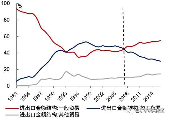 中国2018年出口金额约2.5万亿美元,进口金额约2.1万亿美元,分别较相较2001年底增加了10倍和8倍;中国货物贸易顺差占GDP的比重从2001年的1.68%最高上升至2007年的7.53%。2008年金融危机之后,随着国际经济贸易格局进入深度再平衡,中国贸易差额占GDP的比重逐渐下滑,2018年已经降至3%以内较为合理的水平;同时中国贸易结构也发生了本质性的变化,一般贸易占比自2008年开始超过加工贸易占比,2016年一般贸易占比已经上升至55%,而加工贸易占比下降至30%,出口附加值不断增加。中国制造业在国际分工中,已经开始从“微笑曲线”的底端(以组装为主)逐渐向两头(上游的开发、生产和下游的销售、服务)延伸,供应商本土化的趋势尤为明显。