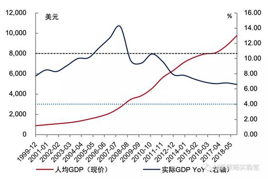 中国人均GDP自2010年超过3000美元跨入上中等收入国家行列后进一步向更高水平发展。2016年人均GDP超过8000美元,2018年人均GDP达到9764美元,按年度汇率均值计算,2019年我国人均GDP有望突破10000美元大关,进入中等偏上收入行列,“十四五”期间将在该行列进一步巩固并提升。