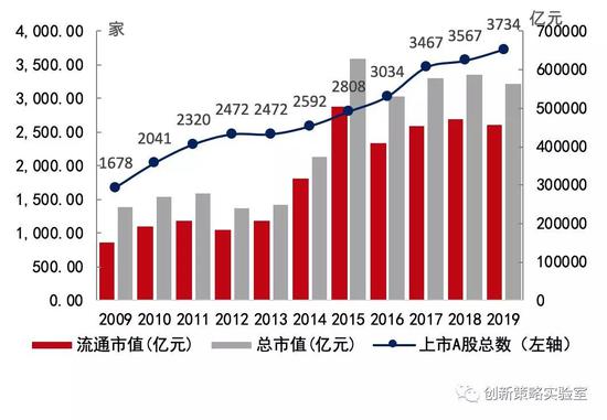 近十年以来,A股市场显著扩容。上市公司数量从2009年的1678家增加至2019年12月23日的3734家,年均增加200多家;上市公司总市值从2009年的24万亿元增加至2019年的56万亿元,流通市值从15万亿元增加至45.5万亿元。
