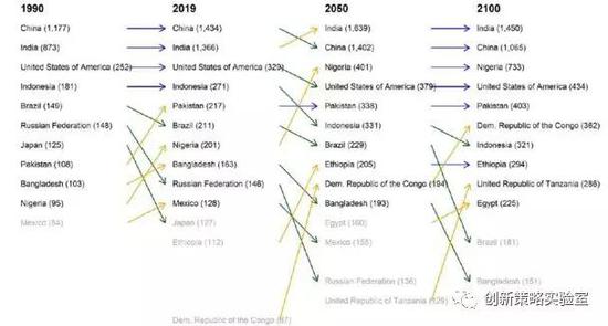 图3-2:世界十大人口最多的国家排名及人口预测