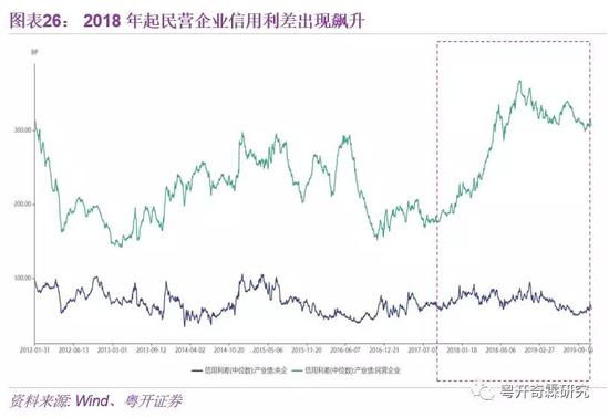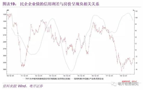 可以从信用利差的视角来观察房地产与民企融资的关系。信用利差是民营企业发债成本与同期限国债发行成本的差值,信用利差越大,说明市场越不看好民企债。而房价与民营企业的信用利差呈负相关关系,即房价上涨,民营企业信用利差下降。