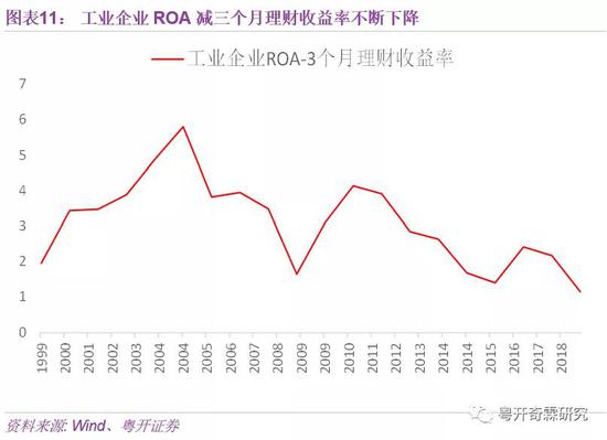 由于市场上持续存在着融资需求,金融产品的回报率很高。但在实体经济下行的情况下,工业企业的ROA回报持续低迷。对比之下,企业投资金融理财产品,反倒更能保障收益,因此大量资金最终涌向了金融市场。