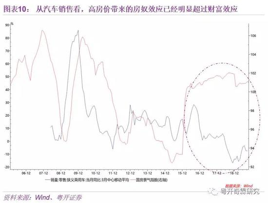 以汽车消费为例,当财富效应大于房奴效应时,居民会由于房价上涨、财富升值进而购买汽车等消费品,但是当房奴效应明显超过财富效应的时候,居民房贷压力过大,将导致其不敢花钱、无钱可花,使得汽车销量下滑,进而导致一些对汽车依赖度高的地区GDP增速下滑。