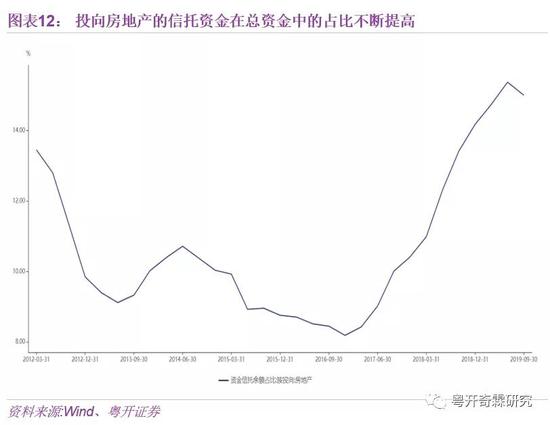 在这些金融产品中,房地产信托的回报率最具吸引力,部分房企的信托项目回报率甚至能到两位数。资金信托余额中投向房地产的资金占比不断升高,2017年后的占比上升速度尤为迅猛。换言之,这意味着大量的社会资金流向了房地产,对实体经济造成了明显的挤出效应。