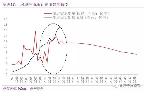 目前房地产实际销量已经超出了应有销量,经济增长的中长期动力亟需切换。按2050年实现城镇化率80%,人均住房面积达到50平的目标反过来倒推,今年应该实现的住房销售量应为11亿平米,但实际住房销售量却高达17亿平米。