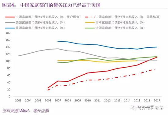 如果使用居民债务余额除以GDP作为居民杠杆率,中国目前的居民杠杆率约为55%。但考虑到GDP并非完全分配给居民部门,政府和企业获得了较高比例,使用债务余额/GDP并不能很好反映居民部门的债务情况。若将分母替换为城乡调查口径的居民可支配收入,那么中国家庭部门的偿债比率高达106%,甚至超过美国。