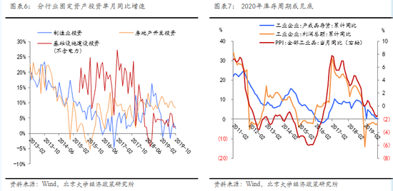 中美关系企稳将促进制造业投资反弹。受中美贸易谈判影响,2019年制造业企业观望情绪较浓,年初制造业投资增速即遭遇断崖式下滑,4月和8月单月同比增速甚至进入负增长区间,1-10月制造业投资累计同比仅增长2.6%,比上半年和上年同期分别回落0.4和6.5个百分点。中美贸易谈判的转折造成不稳定预期,使得制造业企业信心不足、投资意愿弱。即2019年10月初步达成第一阶段经贸协议后,11、12月制造业PMI超预期回升至50.2,预示着我国制造业企业信心回转。展望2020年,中美关系改善将有助于市场形成相对稳定的预期,提振制造业投资。另一方面,工业企业的库存周期接近底部,今年有可能进入补库存的上升周期,利好制造业投资。2019年我国制造业PMI连续六个月跌至荣枯线以下,工业产品出厂价格(PPI)同比跌至负区间,工业企业利润增速在负增长区间震荡,工业领域结构性通缩风险上升。基于过去库存周期的持续时间、底部水平和利润表现,市场普遍预期本轮库存周期的去库存正接近尾声,2020年可能迎来拐点。