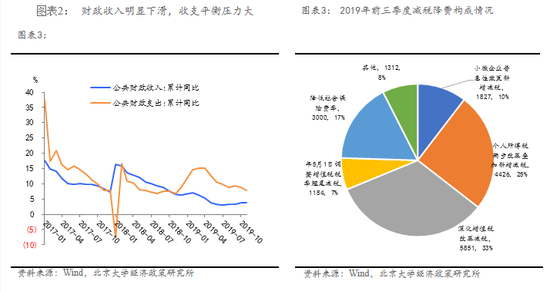 减税政策叠加经济下行压力使我国税收增速明显回落,而财政支出刚性不减,收支平衡压力持续增加。目前全年减税降费规模将远超过年初估计的2万亿,据财政部部长刘昆透露,前三季度减费降税规模已达1.78万亿,预计全年将达到2.3万亿。截至2019年11月,全国财政收入累计增长3.8%,增幅同比回落3.0个百分点,财政收入完成全年预算难度较大。大规模减税降费给财政尤其是地方财政带来减收压力,前三季度税收收入同比增速下降0.4%,与名义GDP 增速的裂口差创下新高。财政支出方面,1-11月全国一般公共预算支出206463亿元,增长7.7%,高于收入增幅3.9个百分点。而我国对脱贫、“三农”、科技创新、交通运输、生态环保,以及社保、教育、卫生等民生重点领域的投入只增不减,加大了收支平衡的压力,一些地方落实保工资、保运转、保基本民生难度大。综合来看,2020年赤字率将小幅提升至3%,赤字规模或将增长 4000--5000 亿,整体规模将介于3.16-3.27 万亿左右。实施新预算法以来,中央和地方赤字占比一直较为稳定,分别占2/3 和1/3 左右,预计2020 年这一赤字结构仍将延续。预计地方赤字破1 万亿,中央赤字破2 万亿。