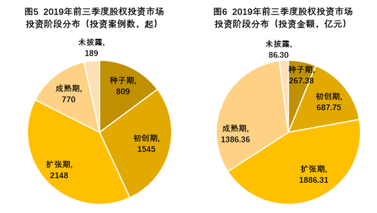 从投资阶段情况来看,2019年前三季度扩张期投资案例数量最多,达到2148起,其次是初创期1545起,之后是种子期809起,最后是成熟期实现770起。投资金额上处于快速发展阶段的扩张期企业金额数量最高,达到1886.31亿元,超过了拟IPO的成熟期企业,剩下的由高到低依次是成熟期1386.36亿元,初创期687.75亿元,种子期267.38亿元。