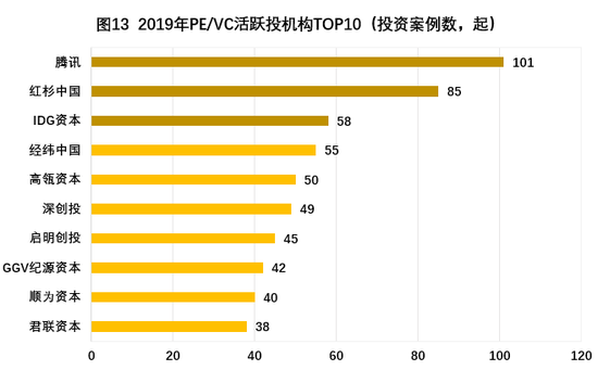 根据IT橘子显示,截止2019年12月底,共计4925家VC/PE投资机构参与了投资,投资案例数量一百起以上的有一家,为腾讯。除此之外投资案例数量达到50以上的还有红杉中国、IDG资本、经纬中国和高瓴资本。