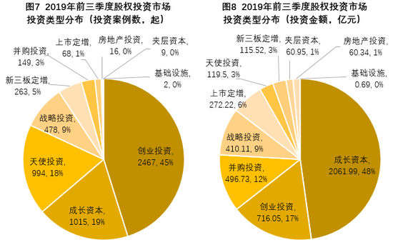 从投资类型来看,2019年前三季度无论是投资案例数和投资金额,主要还是以成长资本及创业投资为主,占据了总量的60%以上;天使投资的投资案例数占总数的18%,但也因其单笔投资金额较少的原因,投资金额仅占总量的3%。