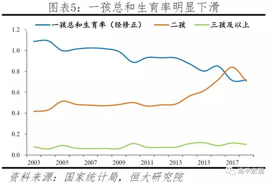 全面二孩政策不及预期,生育堆积效应业已消退,2018年出生人口降至1523万,即减少约12%。“单独二孩”和“全面二孩”政策均未能扭转低迷生育趋势。2014年“单独二孩”放开后,出生人口1687万、比2013年增加不到50万。2016年“全面二孩”放开后,出生人口攀至1786万、创2000年以来新高,但2017年就降至1723万。从分孩次生育情况看,2014年以来二孩总和生育率明显回升,这主要在于75后较强的二孩生育意愿集中释放,但一孩生育率走低和育龄妇女规模逐年下滑,预示出生人口后将大幅下滑。2013-2017年二孩总和生育率明显回升,二孩出生人口占比从31.1%上升至51.3%。但一孩总和生育率总体下滑,出生人口占比从64.3%大幅下滑至42.0%。一孩总和生育率的明显下滑意味着不少年轻人连一孩都不愿意生,而没有一孩就不会有二孩。2018年中国出生人口比2017年减少200万、约12%,总和生育率降至1.52。