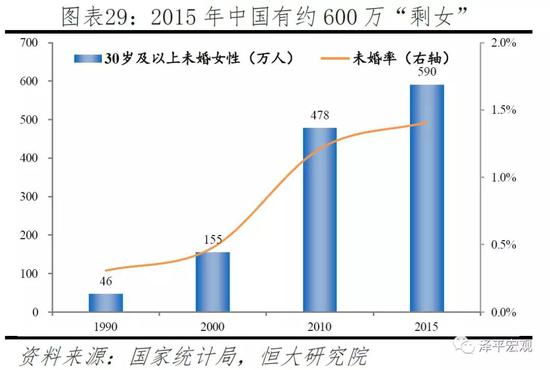2)因婚姻市场匹配问题及单身主义等,“剩女”规模快速增加至约600万,学历越高“剩下”的概率越大。在婚姻市场中,女性多偏好不低于自身条件的男性,男性多偏好不高于自身条件的女性。这意味着即便婚姻市场男女性别比平衡,条件最好的女性和条件最差的男性也最有可能被剩下。1990年中国30岁及以上未婚女性仅为46万,2000年超过154万,2015年攀升至590万;其中,30-34岁女性未婚率从0.6%攀升至7.0%。从城乡分布看,2015年城市30岁及以上女性未婚率为2.4%,明显超过建制镇的1.0%、农村的0.9%。从受教育程度看,30岁及以上研究生学历女性未婚率高达11%,远高于本科学历及以下女性未婚率的5%。