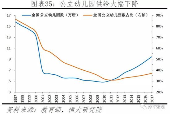 2)教育成本明显攀升,特别是公立幼儿园供给严重不足,1997-2017年中国公立幼儿园在读人数比例从95%降至44%。当前教育成本主要包括幼儿园学杂费、幼儿园及小学初高中阶段辅导班费用、大学学费及生活费等。根据新浪教育《2017中国家庭教育消费白皮书》抽样统计,学前教育阶段教育支出占家庭年收入的26%,义务教育和高中教育阶段占21%,大学阶段占29%。公立幼儿园供给大幅下降,许多家庭被迫选择价格昂贵的私立幼儿园,是学前教育费用高昂的一个重要原因。1997年公立幼儿园数占比86.5%,在园人数占比94.6%。从2001年开始幼儿园被大量推向社会办学,加上基层中小学大量撤点并校,尤其在农村,导致农村、县镇、城市幼儿园分别大幅减少4、1.5、0.9万所。2001-2017年全国幼儿园所数从11.2万增至25.5万所,公立幼儿园数从6.7万所减少至2010年的4.8万所,再回升至2017年为9.5万所,占比从60.1%降至30.7%再回升至37.1%;但公立幼儿园在园人数占比未有回升,从83.1%持续降至44.1%。城市、县镇、农村的公立幼儿园在园人数占比分别从75.5%、74.8%、90.6%下降至2016年的35.7%、33.4%、57.7%。此外,当前双职工父母面临中小学子女的接送难题。不少地方甚至还要求由父母批改学生家庭作业、并讲解错题,逐渐演变为“家庭作业演变成为家长作业”、“教师减负、家长增负”。