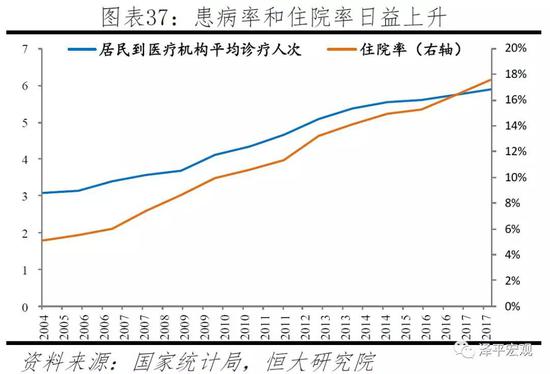 3)医疗费用持续上升,1995-2017年居民医疗保健支出上涨22.4倍,远超可支配收入9.2倍的涨幅。由于环境污染、工作生活压力加大及人口老龄化等原因,患病率上升,医疗费用也持续上升,影响家庭生育决策。2004-2017年,中国居民中国居民平均到医疗机构诊疗人次从3.07人次上升至5.88人次,住院率从5.1%升至17.6%。根据《2017年我国卫生健康事业发展统计公报》,公立三级医院人均门诊费用为306元、人均住院费用13088元、日均住院费用1334元。在此影响下,1995-2017年全国居民人均医疗保健支出从62元升至1451元,上涨22.4倍,远高于人均可支配收入9.2倍、人均消费性支出8.4倍的涨幅;其占消费性支出的比重从3.2%上升至7.9%,其中城市从3.1%升至7.3%,农村从3.2%升至9.7%。