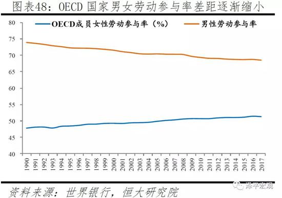 三是日本“男主外、女主内”性别分工较为普遍,职场性别歧视严重越来越多日本女性放弃结婚生育,1990-2015年50岁以上女性终身未婚率从4.3%激增至14.6%。与芬兰、瑞典等国将部分育儿养老工作社会化并由国家承担不同,日本的育儿养老责任多由家庭女性承担,将女性的角色定位为全职家庭主妇的思想仍然存在,“男主外、女主内”思想较为普遍。根据世界银行,2017年日本的女性劳动参与率达50.5%,低于OECD平均的51.3%;2017年日本男女劳动参与率差距达20.1个百分点,高于OECD平均的17.2个百分点。根据OECD,2014年日本的男女就业率差距为17.9个百分点,高于OECD平均的11.8个百分点;2016年日本的全职员工中男性和女性的收入中位数差距为24.6%,高于OECD国家13.5%的平均水平。越来越多的日本女性选择(暂时)放弃家庭,进入职场。根据日本国立社会保障和人口问题研究所,1990、2010、2015年男性终身未婚率分别为5.6%、20.4%、23.4%,女性分别为4.3%、10.6%、14.6%。日本社会已形成了一种不愿结婚和生育的观念,积重难返。