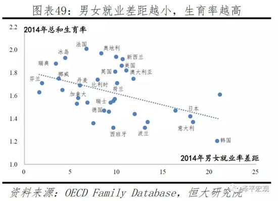 第四,加强女性就业权利保护,男女就业差距越小,生育率越高。OECD国家重视女性就业权利保护,如瑞典政府主导的公共服务事业为女性提供了大量的就业岗位,德国、韩国、日本、新加坡都为产后女性的再就业提供培训等。根据世界银行,1990-2017年OECD成员女性劳动参与率(15岁及以上)从47.8%上升至51.3%,男女劳动参与率差距从26.1个百分点降至17.2个百分点。一般而言,男女就业差距越小的国家,意味着女性的就业权利得到了更好地保障,生育率越高。如2014年瑞典男女就业率差距仅为3.4个百分点,总和生育率为1.88;而意大利男女就业率差距为18.2个百分点,总和生育率仅为1.37。2006-2016年OECD国家的男女收入中位数差距从15.6%下降至13.5%。1990-2017年中国女性劳动参与率从73.2%降至61.5%,劳动参与率差距从11.6个百分点扩大到14.6个百分点。