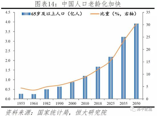2)人口老龄化加快,养老负担日益加重,2018-2050年中国老人比重将从12%快速升至30%。老龄化是全球普遍现象,但中国由于计划生育老龄化速度前所未有。1970-2015年中国人口年龄中位数从19.3岁快速升至37.0岁,预计2050年将达50岁。从国际看,2015年美国、欧洲、日本、印度人口年龄中位数分别为37.6、41.6、46.3、26.7岁,到2050年将分别为42.0、46.6、53.2、37.5岁。从65岁老年人口占总人口超过7%的老龄化过渡到超14%的深度老龄化,法国用了126年、英国46年、德国40年、日本25年(1970-1994年);从深度老龄化到老年人口占比超过20%的超级老龄化,德国用了36年(1972-2008年),日本用了11年(1995-2006年)。中国2001年65岁及以上人口占比超过7%、进入老龄化社会,2018年占比达11.9%,预计中国将用约22年、即于2023年前后进入深度老龄化社会,再10年后即2033年前后进入超级老龄化社会,2050年达30.0%,老龄化速度前所未有。而且,由于人口基数大,老年人口规模也是前所未有。2018年中国65岁及以上人口已达近1.7亿,预计2050将达3.9亿,届时每3.3个中国人中就有1个65岁以上的老人。