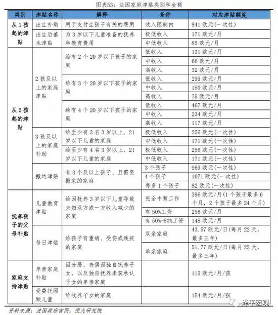 2)发放经济补贴,涵盖出生、养育、托幼、父母收入损失等多方面,2013年法国家庭福利开支占GDP比重达3.7%,在OECD国家中排名第三。目前法国已建立比较完善、多样化的津贴制度,涵盖幼儿出生、养育、托幼、对父母收入损失的补贴等多个环节,且补贴金额依据家庭收入和孩子数量等存在明显差异。根据OECD数据,2013年法国家庭福利开支占GDP比重为3.7%,在OECD国家中排名第三,仅次于英国和丹麦,高于OCED平均水平的2.4%。