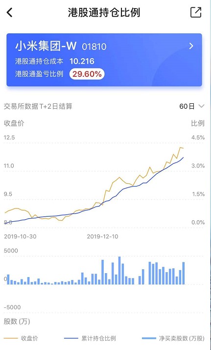 值得注意的是,在港交所一系列的规章制度改革以后,小米股价的趋势改变,与互联互通南下资金的强力介入有很大的关系。智通财经的大数据显示,南下港股通持有小米的流通筹码已相当积极,从2019年12月开始,就已经进入了“买买买”模式。