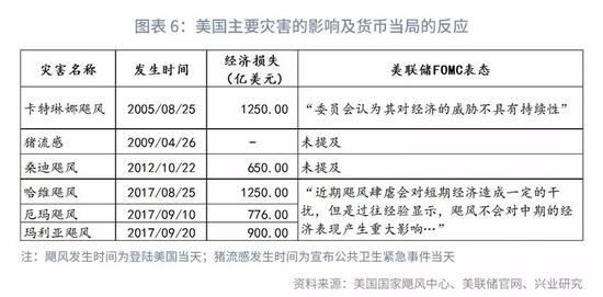 我们从历次灾害发生时,美联储FOMC(美联储公开市场操作委员会)会议决议的表态来看,其认为飓风对于经济短期产出、通胀等都会产生明显影响,但是从历史经验上来看,其对中期经济增长的基本面不会有重大影响。那么换句话说,只有在灾害对经济中长期经济增长基本面产生根本影响时,美联储才会进行更大力度的宽松。