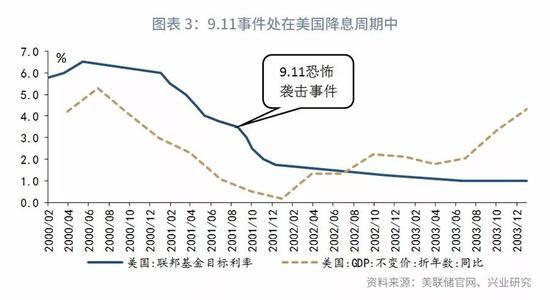 这些短期政策之外,美联储在2001年9-12月连续4次下调联邦基金利率,前三次下调幅度都高达50bp。从美国联邦基金利率的变化曲线可以看到,事件发生之后联邦基金利率下调幅度明显高于事件发生之前。9.11事件冲击加快了美联储降息的节奏。