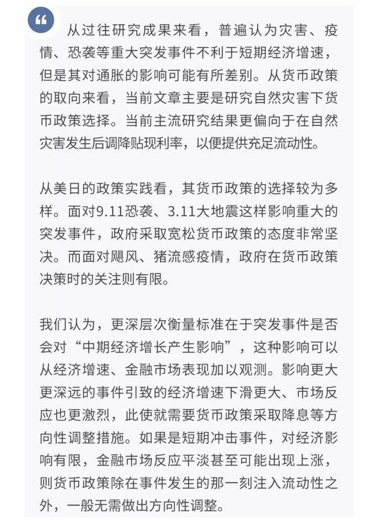 从前文来看,货币政策在面对疫情、自然灾害、恐怖袭击等重大突发事件时并没有一个固定的范式。那么决策的关键在哪里呢?从美联储的表态来看,我们认为事件是否影响到“中期经济增长的基本面”和金融稳定才是重点。