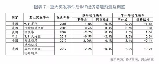 在经济增速方面,重大突发事件之后,IMF的经济增速预期调整是一个观测指标,不同的冲击IMF的预期调整情况也不同。比如,卡特琳娜飓风和桑迪飓风发生后,IMF反而上调了美国经济增长预期,主要还是基于当时强劲的经济走势。而在9.11恐袭、3.11大地震之后则对经济增速预测值进行明显下调。大地震直接导致2011年日本经济增速预测下滑了2.1个百分点。9.11恐袭的影响则更为滞后,当年的调降幅度为-0.5%,但是对下一年的经济增速预测直接下调1.8个百分点。