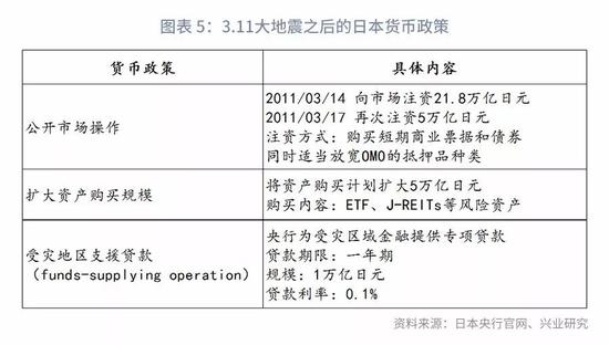 地震发生后日本央行迅速反应,通过加码QE,并选择针对性的品种进行大规模的公开市场操作向市场注入天量流动性。根据日本央行的报告,其在日本震后第一个工作日向市场注入了21.8万亿日元,是2008年金融危机时期最高峰的3倍。一系列及时有效的操作有效缓解市场上流动性紧张的局面,稳定了市场情绪和预期。对于灾后日本金融体系迅速稳定起到非常关键的作用。