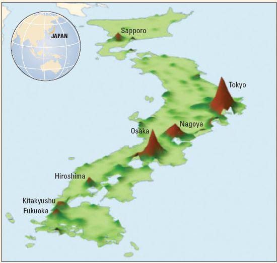 再来看日本,也是一张经济密度的地图,也是三大都市区和其他一些大城市很高,东京(Tokyo)、大阪(Osaka)、名古屋(Nagoya)最高,其他地方你看到的凸起都是大城市,比日札幌(Sapporo),福冈(Fukuoka)。这些大中城市之外,其他地方的经济密度很低的。