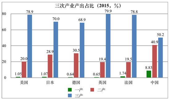 一产占比低,是现代经济这枚硬币的一面。其另一面,就是二产和三产占比高。美国、英国、法国的二产在20%左右的规模,德国和日本高一点,30%左右,我们是40%左右的规模,比这些发达国家都高一些。剩下的都是服务业,美国、英国、法国在80%左右,德国和日本在70%左右。二、三产加起来,在这些国家占98%以上,在我国占91%多一点,未来还会增加。