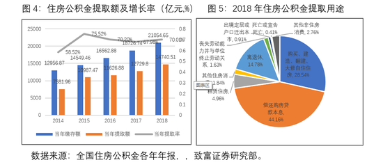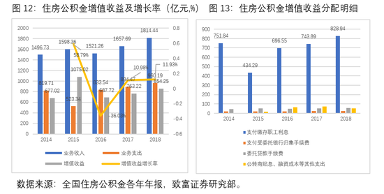 为84.2%,且近两年年增速均超过10%;第二位的是住房公积金存款利息278.33亿元,占比为15.34%。从业务支出来看。2018年,住房公积金业务支出960.19亿元,比上年增长7.35%。从住房公积金业务支出各项明细来看,主要支出是支付缴存职工利息。2018年支付缴存职工利息为828.94亿元,在总支出中占比为86.33%。;第二位的是委托贷款手续费54.80亿元,占比为5.71%;第三位的是公转商贴息、融资成本等其他支出50.79亿元,占比为5.29%。第四,住房公积金的增值收益稳定增长,但是目前收益率偏低。2018年住房公积金增值收益854.25