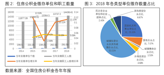 从缴存单位构成来看,以民营企业为主。截至2018年底,住房公积金实缴单位291.59万个,实缴职工14436.41万人。单位数量占比最大的前三名分别为城镇私营企业及其他城镇企业、国家机关和事业单位以及国有企业。其中,城镇私营企业及其他城镇企业为155.44万个,占比为53.31%,实缴职工为4449.85万人,占比为30.82%;国家机关和事业单位为73.87万个,占比为25.34%,实缴职工为4452.39万人,占比为30.84%。