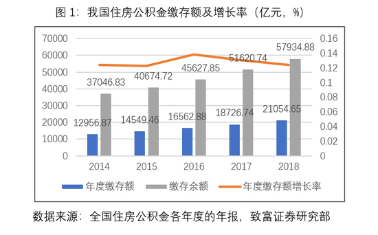 截至2018年底,住房公积金累计缴存总额145,899.77亿,累计提取总额87,964.89亿元,提取后缴存余额为57,934.88亿元。其中,2018年住房公积金缴存额21,054.65亿元,比上年增长12.43%。
