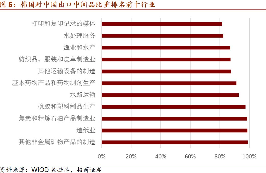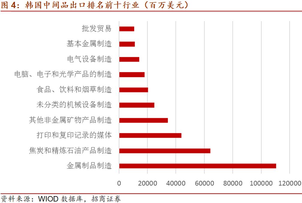 从韩国中间品出口来看,金属制品制造、焦炭和精炼石油产品制造、打印和复印记录的媒体、其他非金属矿物产品制造、未分类的机械设备制造、食品、饮料和烟草制造、电脑、电子和光学产品制造、电气设备制造、基本金属制造、批发贸易等排在前十位,对进口国而言,一旦韩国工业生产出现问题,将直接导致以上行业中间品缺货,从而影响下游产业链。