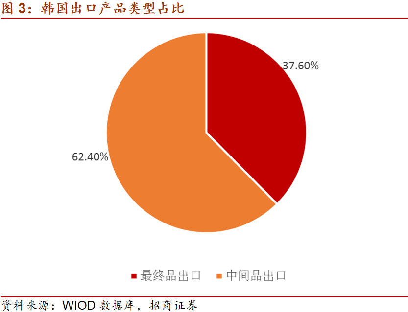 根据联合国Broad economic catalogue(BEC)分类法,按照产品的生产过程或使用原则把商品分为三大类,即初级产品、中间产品和最终产品,中间产品贸易是随经济全球化的深入发展而发展起来的,主要是指一国提供原材料或者半成品出口到他国进行再次加工、组装,代表了一国在全球产业链中的深入程度。从韩国出口类型来看,62.4%出口额处于中间品出口,37.6%属于最终品出口,足见韩国在全球产业链中“供给端”扮演着重要的角色。